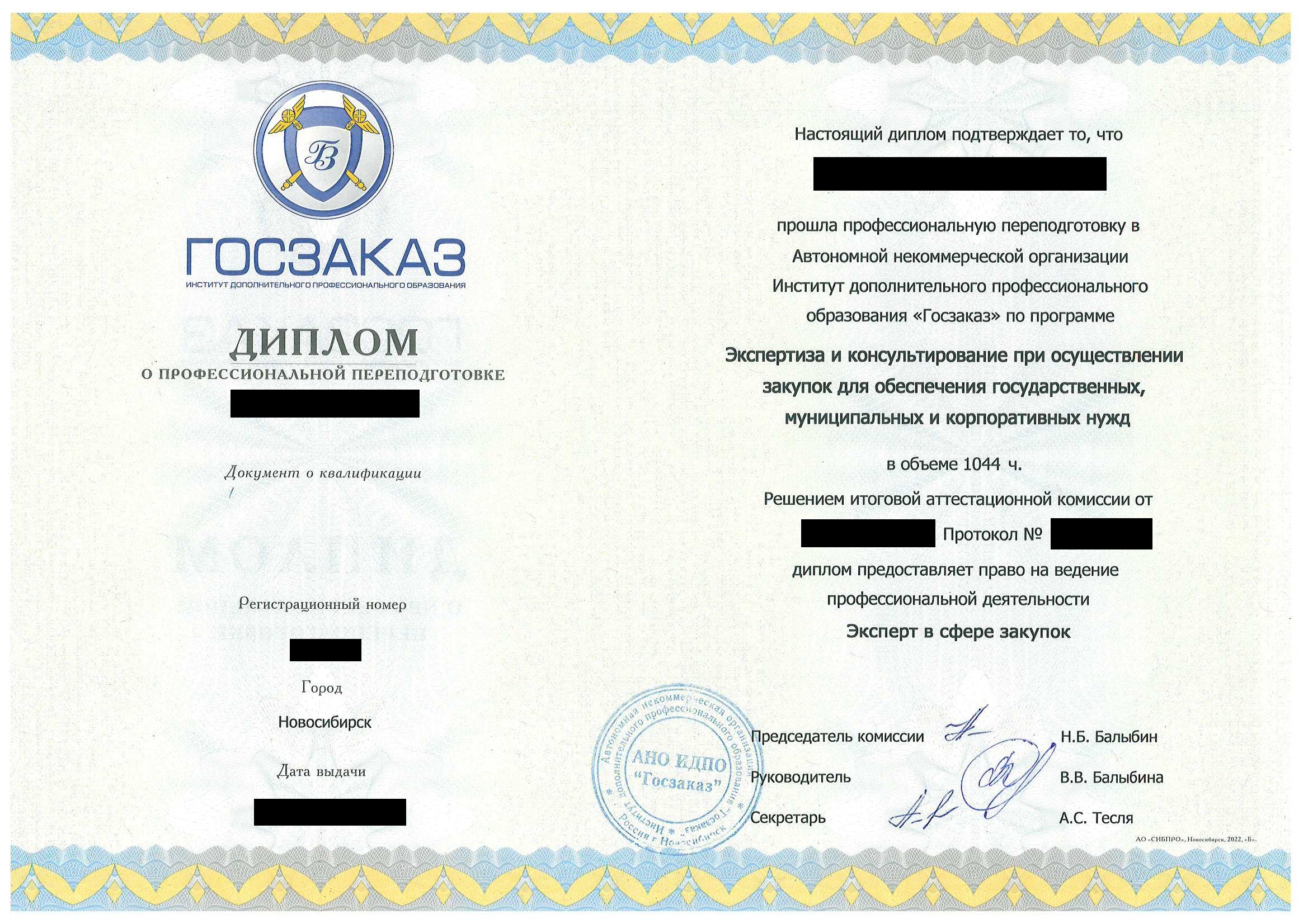 • Диплом о профессиональной переподготовке установленного государством образца. Срок действия: бессрочно